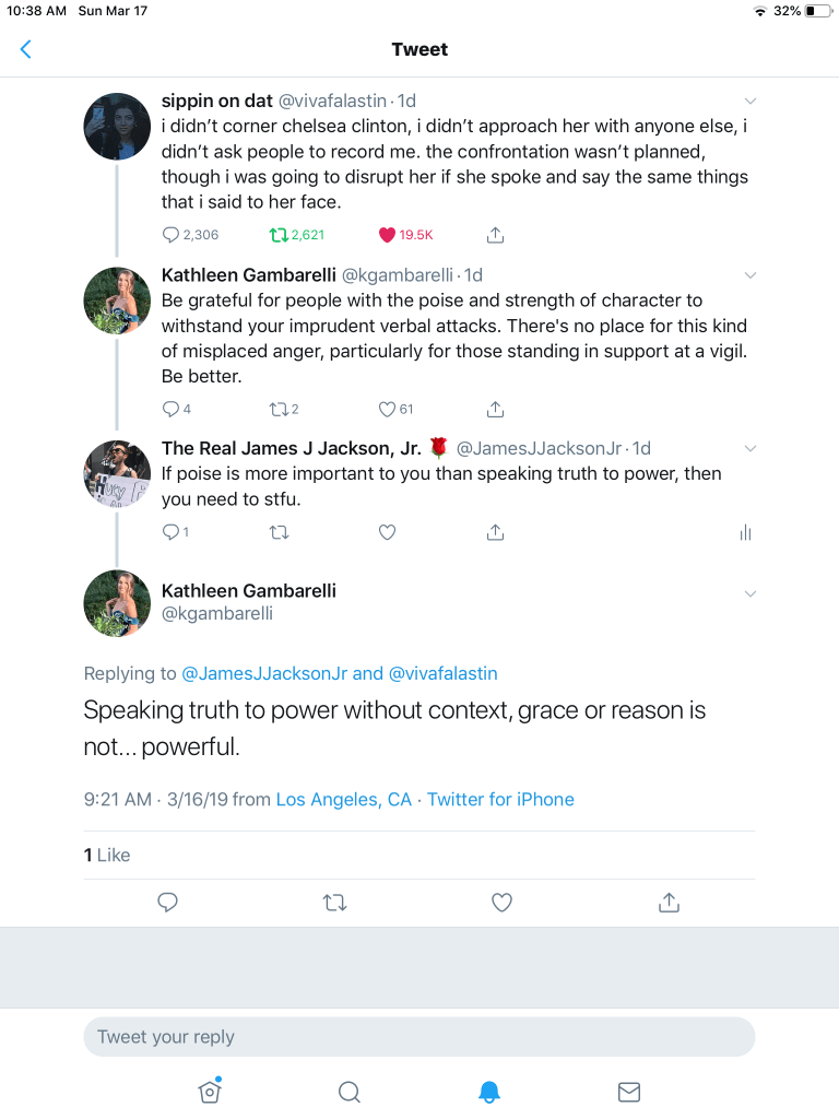 Yesterday a confrontation at a vigil between Chelsea Clinton and a Muslim woman who was in mourning over the Chirstchurch massacre went viral. The video shows that the woman stood up to Clinton for being present at the vigil after Clinton’s comments about Ilan Omar opened up a massive wave of islamophobic attacks against Omar. Clinton never apologized to Omar.